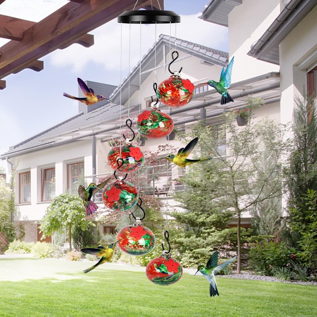 【Innovative Wind Chimes Feeder】 A creative blend of windchimes and humming birds feeders for outside, providing multiple feeding spots. A versatile addition to any indoor or outdoor space. Our feeder transitions from a hummingbird haven to a stunning indoor decoration as the seasons change. Its elegant design and vibrant colors brighten your home in winter, echoing the joy of warmer days. This isn't just a feeder; it's a year-round accent piece adding charm to your space.