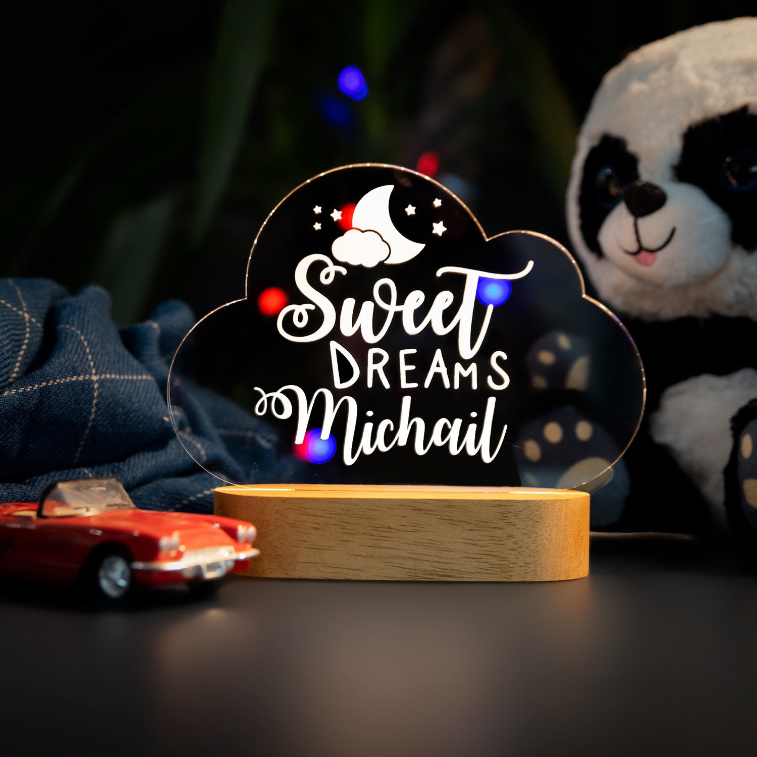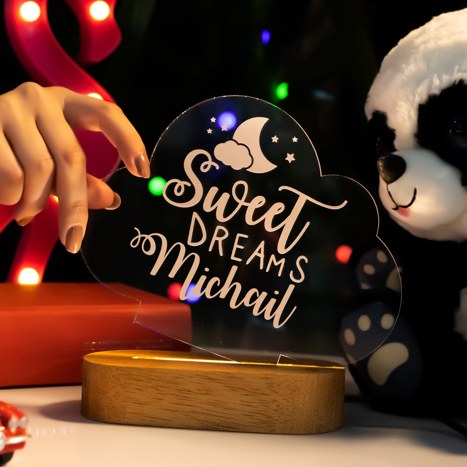 Our night lights can be full customised with any name or text etched into your plaque which will create a unique bedside companion for years to come! You can rest assured that you will receive a high-quality product including your personalised acrylic plaque and wood base but keep in mind that this is not a toy and is for decoration only.