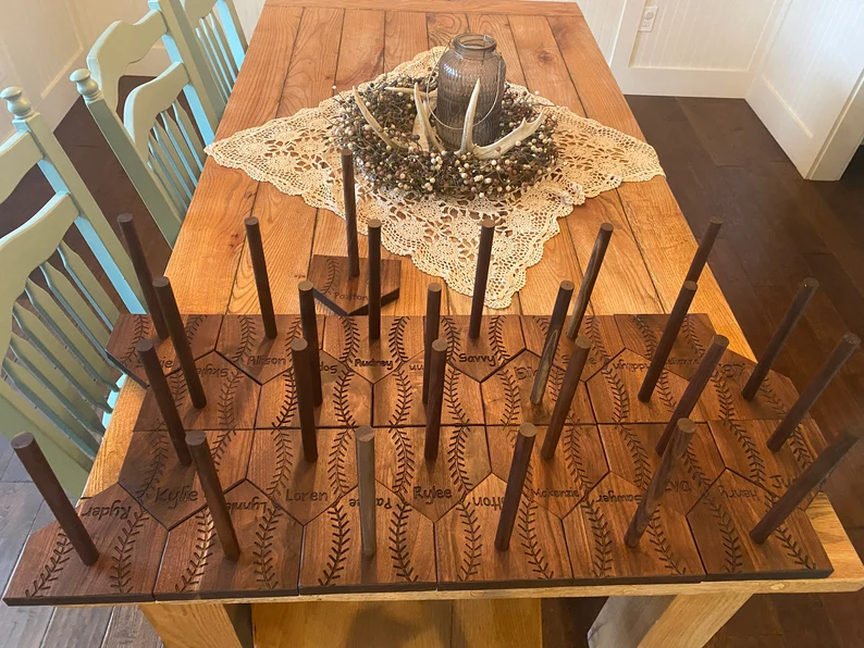 The ring peg fits snugly into the Home Plate Base for easy assembly and comes with a screw to tighten the post into place. All bases include the baseball laces engraving and can also be personalized for free with your favorite players name. Select from 5 stain options. If no personalization is listed, the baseball laces will be the only thing engraved on the base.