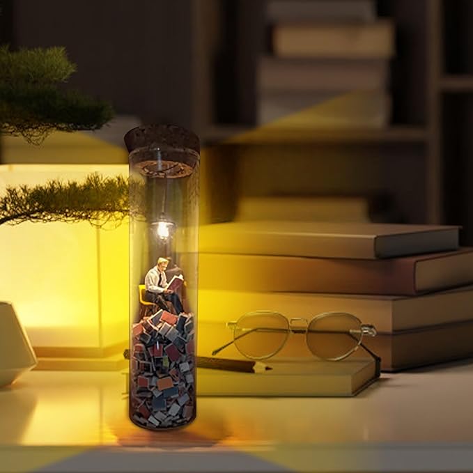 Immerse yourself in the enchanting world of the "test tube diorama" that captures the melancholic ambiance of a bibliophile reading atop a mountain of beloved books.